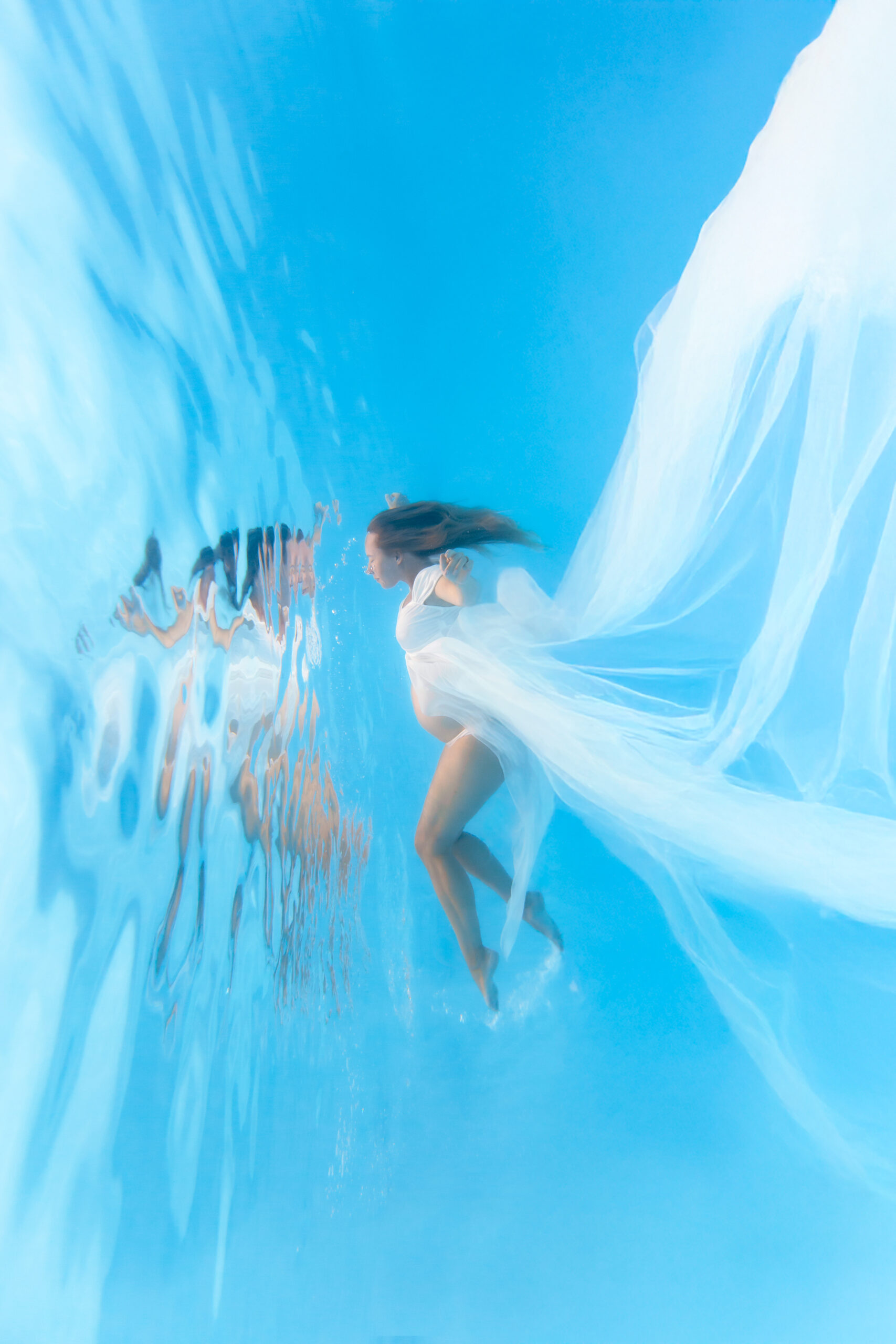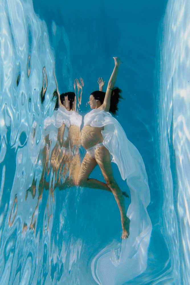 I’d like to say that we can imagine almost anything underwater… I do pregnancy sessions, family sessions with children big and small, couples, brides and grooms in their wedding clothes (Trash the Dress session), and solo photos. So for a special occasion or just to please yourself and have beautiful artistic images, all pretexts are good to jump in!